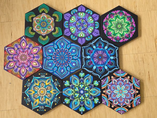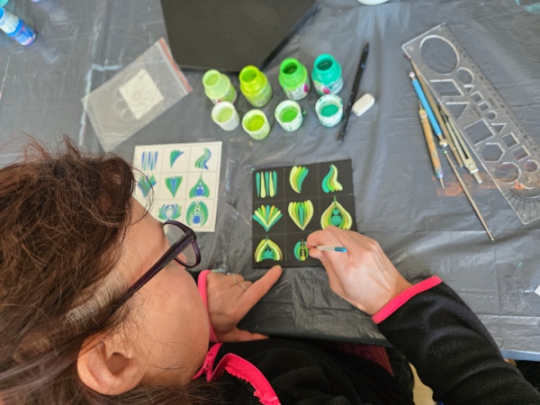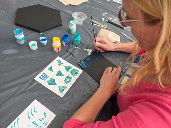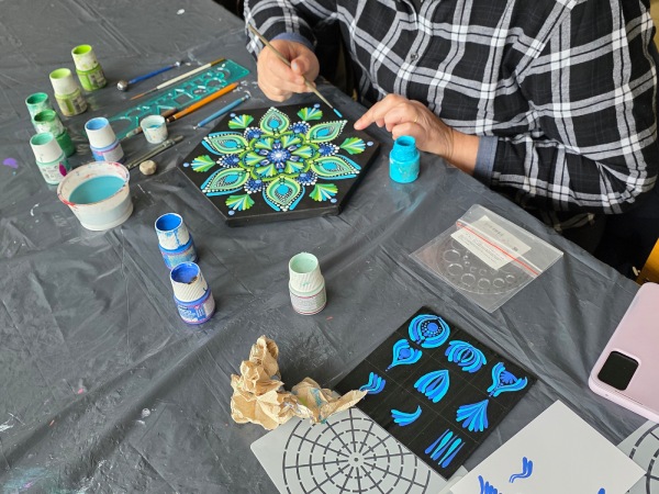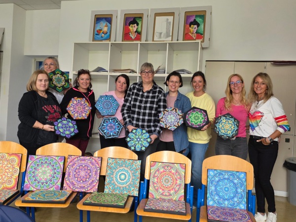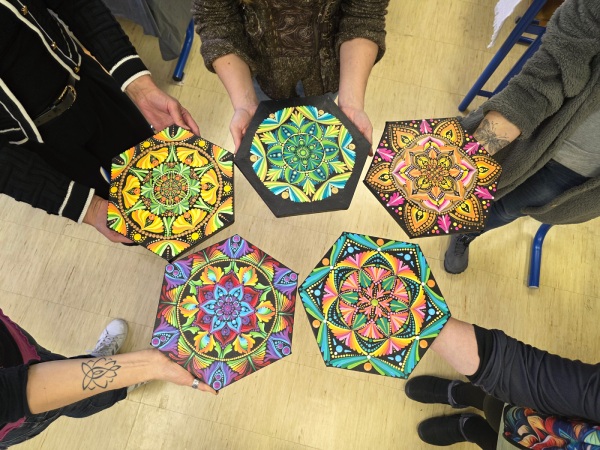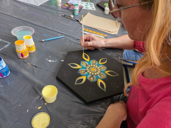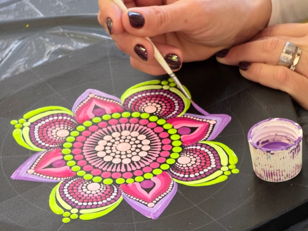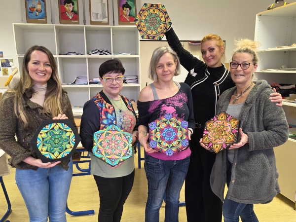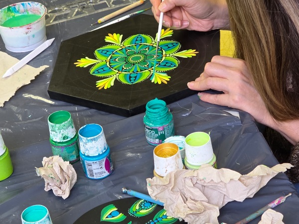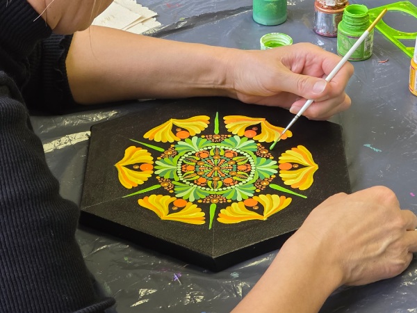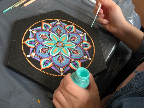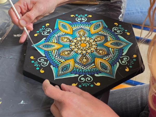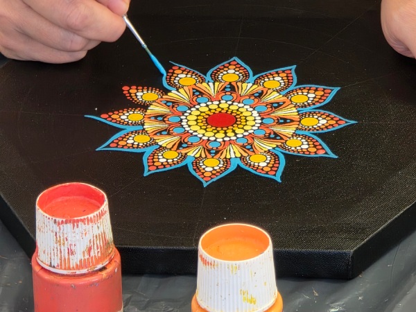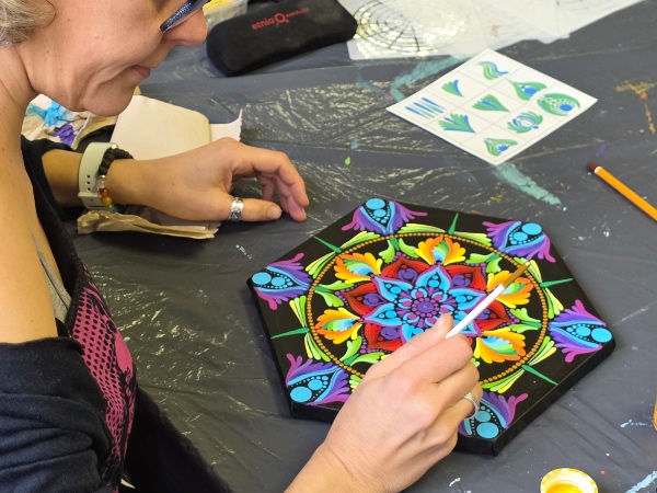 - Nato se lotite svoje mandale na platnu s postopnim vodstvom (izris mreže s šestilom, ravnilom, šablonami, izbira kombinacije barv, navodilo za začetek…)