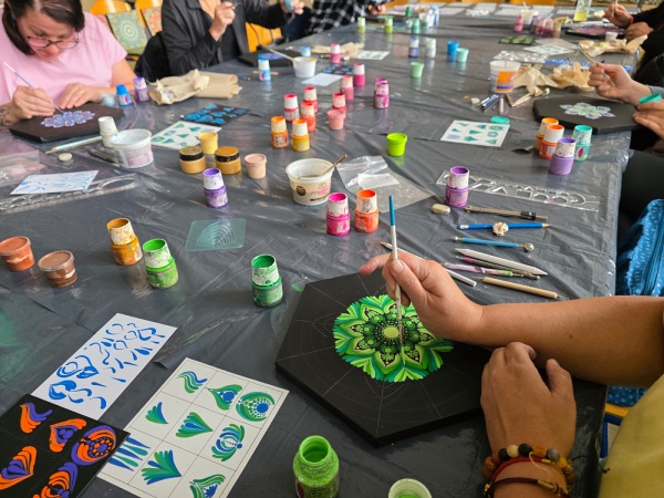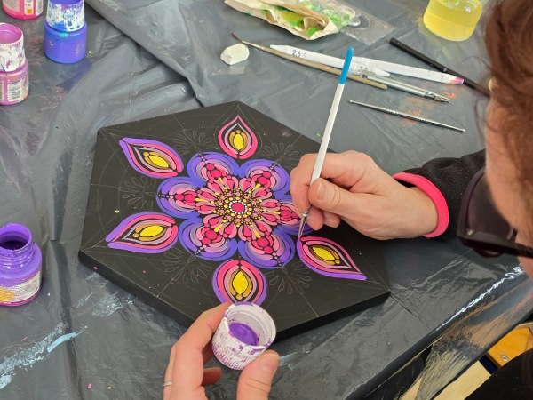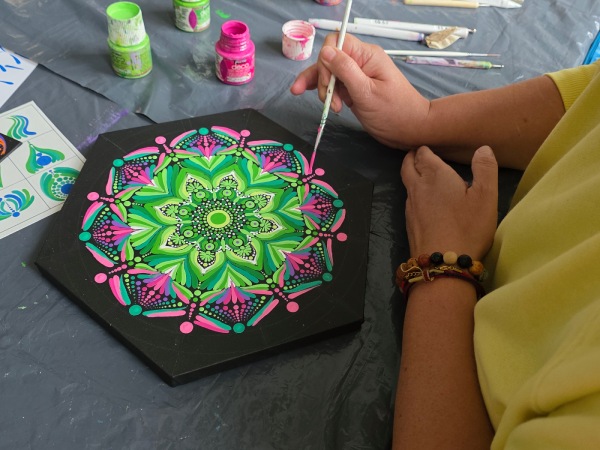 - Ustvarjanje mandal s čopiči je malenkost bolj zahtevno, zato je dobro v živo videti kako se jih dela, kot tudi slišati nasvete, da je čim manj mučenja doma, ko nam ne uspevajo, pa ne vemo zakaj.