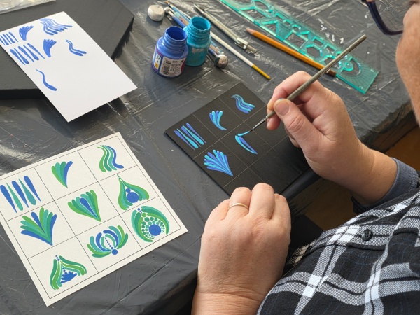 - Ponovimo osnove priprave platna – kakšna platna uporabiti, kako jih pripraviti za ustvarjanje, kako izrisati mrežne črte, kako zarisati vzorce, uporaba ravnil, šestila, šablon ipd.